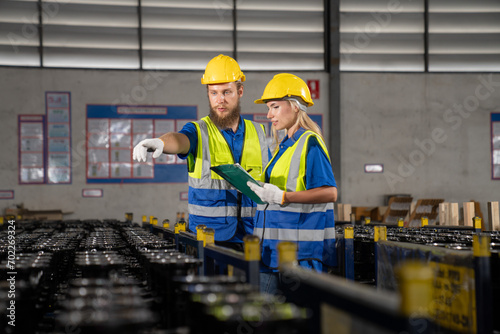 Two professional female and male warehouse checks stock workers, International car parts, import-export, and logistic business concepts: transportation, distribution, industry factory concept.