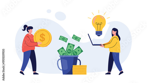 investment, profit, money, business, finance, startup, innovation, idea, light bulb, creative, smart, success, teamwork, collaboration, partnership, growth, wealth, capital, earning, income, bucket, coin, cash, savings, economy, market, woman, character, professional, career, strategy, planning, development, goal, achievement, solution, efficiency, support, together, oneness, future, value