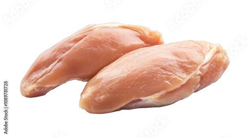 Two raw chicken breast on white backdrop