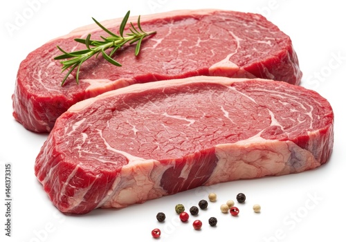 Two raw ribeye steaks with rosemary and peppercorns on white background