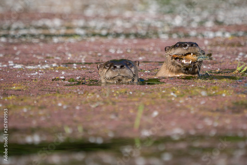 Two river otters swimming together