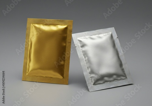 Two sachets, one gold and one silver, positioned on a neutral gray background. The gold sachet has a glossy surface, while the silver is matte.