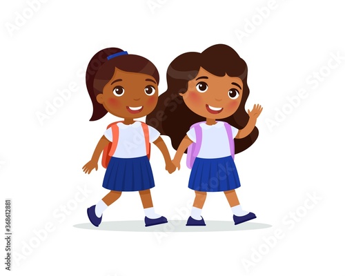 Two schoolgirls going to school flat vector illustration. Couple pupils in uniform holding hands isolated cartoon characters. Two dark skin elementary school students with backpacks waving hand