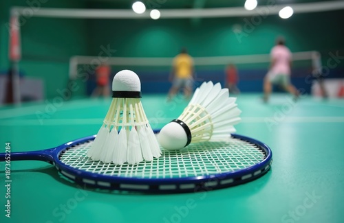 Two shuttlecocks lie on blue badminton racket on green court. Sport players on background playing match. Indoor badminton sport tournament scene. Recreation activity with shuttlecock. Fun game play