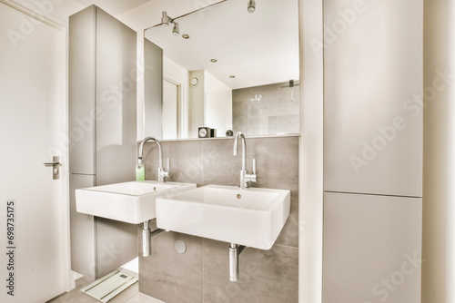sink, mirror, bathroom, faucet, double, ceramic, stainless, steel, white, modern, apartment, home, light, design, house, interior, room, style, contemporary, clean, luxury, space, new, empty, washroom, residential, residence, trendy, estate, domestic, flat, interior design, elegant, concept, wall, copy space, tap, door, washbasin, sanitary, dwell, real estate, property, bathe, closed, indoor, nobody