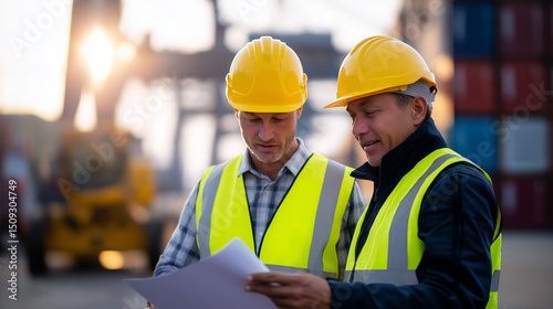 construction, logistic, shipping, port, men at work, safety, blueprint, teamwork, industry, transport, container, cargo, planning, engineering, project, industrial, infrastructure, management, professional, man, architecture, maritime, development, dock, worksite, team, coordination, shipyard, business, technical, outdoors, efficiency, operation, freight