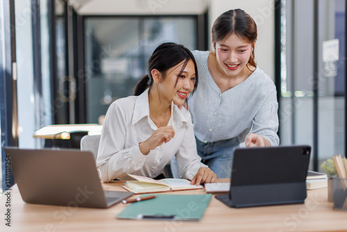 Two smiling happy asian businesswomen working together on a laptop in the office, demonstrating teamwork business meeting in a corporate and collaboration