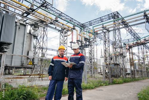 Two specialist electrical substation engineers inspect modern high-voltage equipment. Energy. Industry
