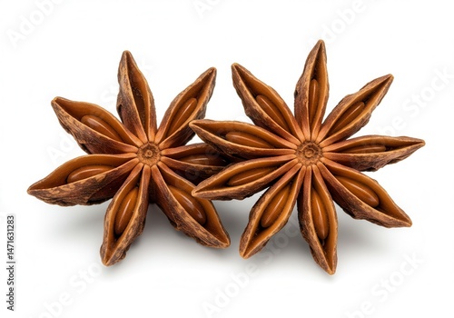 Two star anise spices arranged closely together on a white surface in a close-up shot