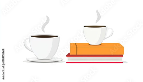 Two steaming cups of coffee placed on a stack of colorful books, evoking a cozy reading atmosphere