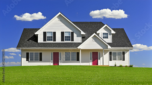 house, home, real estate, property, residential, architecture, building, exterior, white, black, roof, window, door, grass, landscape, sky, cloud, suburban, new home, white house, greengrass, blue skies, two-story, house for sale, for sale, building exterior, luxury home