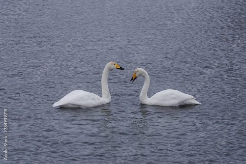 Two swans in love swim beautifully on a winter lake. "Lebedinyj" Swan Nature Reserve, "Svetloye" lake, Urozhaynoye Village, Sovetsky District, Altai region, Russia
