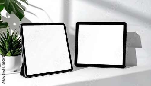 Two Tablets with Blank Screens and Green Plants on a White Surface with Shadow Play