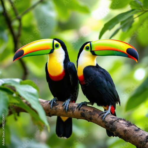 Two Toucans Perched on Branch with Lush Green Foliage Backdrop