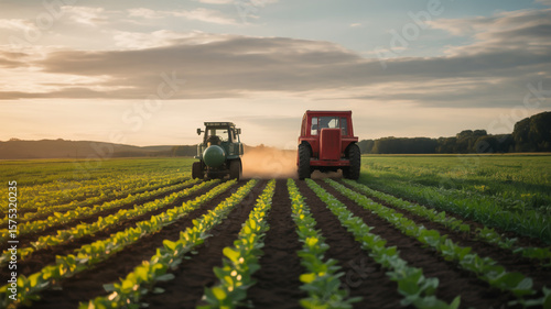 Two tractors working in a field at sunset, cultivating the land for crops