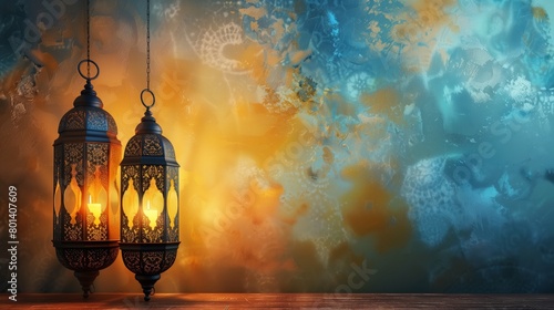 Two traditional ornate lanterns hanging against a vibrant textured blue and orange background.