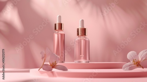 Two transparent dropper bottles with pink liquid and white caps are sitting on a pink surface. There are some white and pink flowers next to them. The background is a pale pink color.