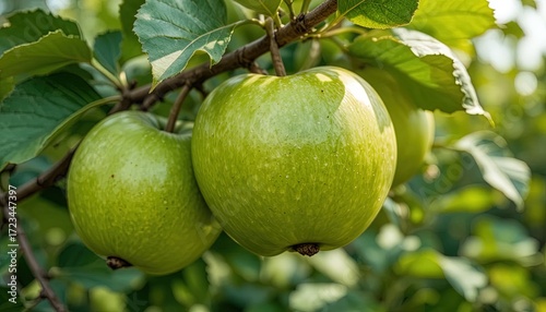 Two vibrant green apples hang on a branch, bathed in natural light, showcasing a close-up view of their textured skin and the surrounding foliage.