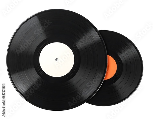 Two vinyl records, one larger with a white center, and one smaller with an orange center, isolated on a white background
