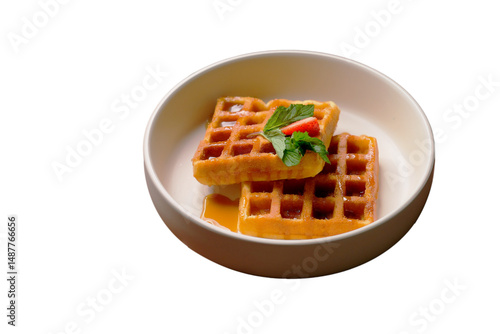 Two waffles with caramel, strawberry, and mint in a white plate, a cropped PNG object.