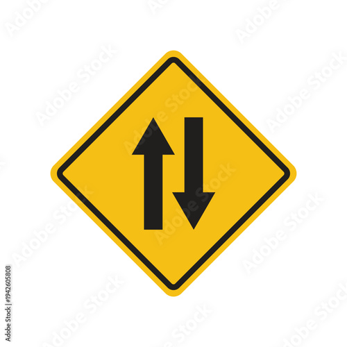 Two way traffic road sign. Yellow diamond warning sign with black up and down arrows