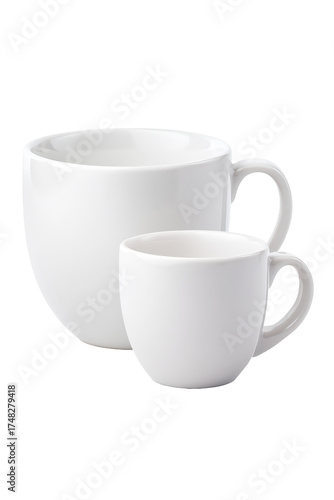 Two white ceramic coffee cups, one large and one small, isolated on transparent background