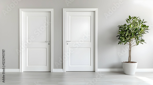 Two white doors, plant, grey wall, modern interior, home decor