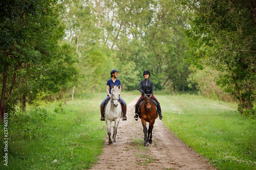 bay, friends, diversity, english, equine, grey, helmet, horse, path, riding, summer, trail, woman