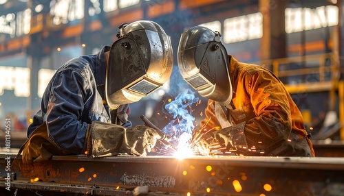 Two workers in protective gear weld metal, sparks flying, bright light, industrial setting, focus on the process