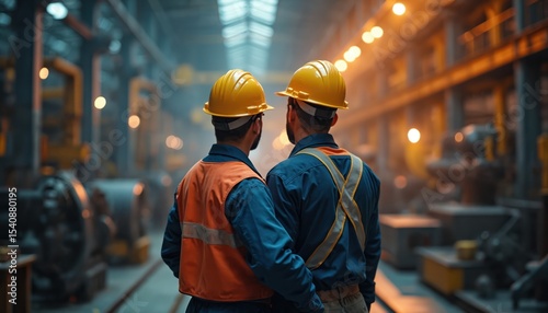 Two workers in protective uniform and hard hats stand in an industrial plant. Focus on workers, safety, team in power plant, factory. Industrial sector tech. Metalworking industry theme.