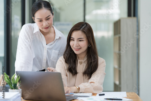 Two Young Asian businesswomen discuss with new startup project Idea presentation and analyze planning and financial statistics and investment market at an office.