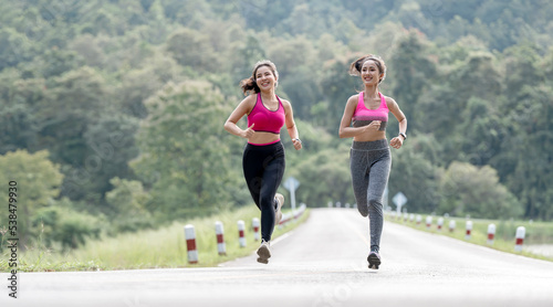 Two young asian woman in sportswear running together outdoors.