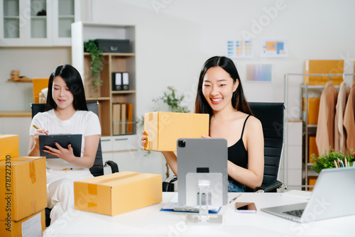 Two young businesswomen exchanging delivery boxes in a modern startup office. Perfect for online business, e-commerce, and small entrepreneur concepts.