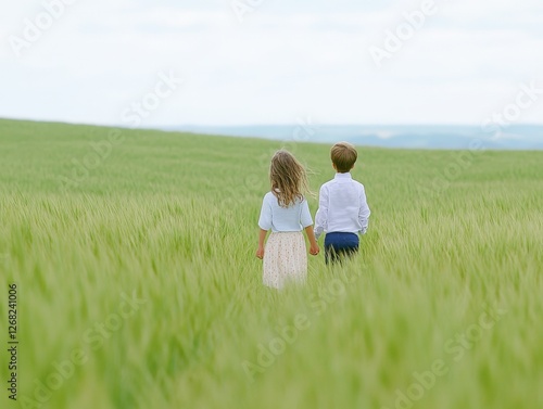 Two young children walking hand in hand through lush green field symbolizing innocence childhood friendship and carefree outdoor exploration