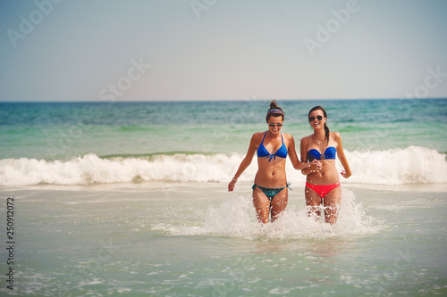 Two young women running in water