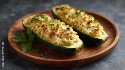 Two zucchini boats on a wooden plate. the zucchinis are stuffed with a creamy mixture of cheese and herbs, and are garnished with fresh parsley.