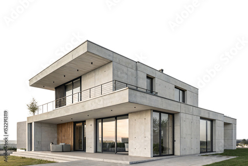 Two-story concrete home with modern design balcony and floor-to-ceiling windows, isolated on a transparent background