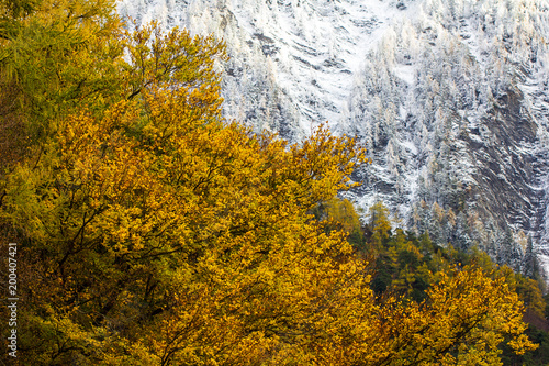 Übergang von Herbst zu Winter mit schneebedeckten Bäumen im Wald und bunten Bäumen