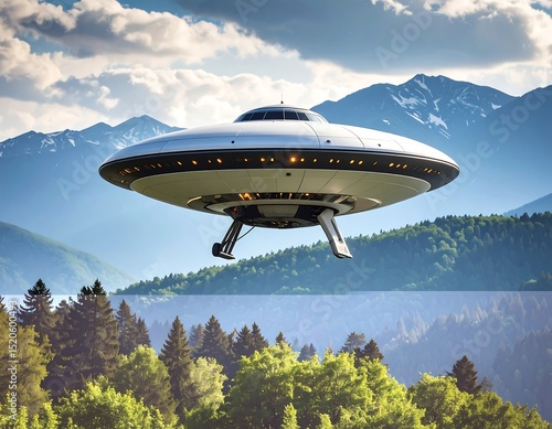 flying saucer, flying, saucer, spaceship, mountain, landscape, cloud, sky, nature, forest, tree, lake, green, white, grey, peace, mystery, alien, object, amazing, beautiful, scene, fantastic, technology, future, imagination, modern, composite, view, high, altitude, peaceful, travel, adventure, stunning, photorealistic, digital, graphic, art, science, fiction