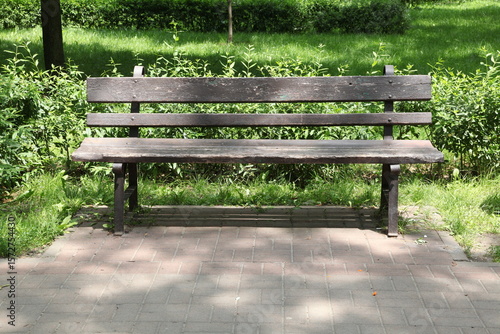 Ukraine. Kyiv. A bench in a summer park. There are many trees and bushes around.