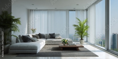 Ultra-modern living room with large windows for city views, minimalistic furniture, and contemporary design accents.