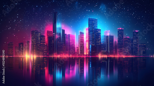 city, skyline, water, vibrant, night, neon, light, reflect, create, futuristic, tower, high-coloured, night time, dynamic, travel, beauty, downtown, ambience, atmosphere, colours, structure, viewpoint, skyscraper, design, allure, luxury, vision, synthesis, shadow, scenery, landscape, brilliance, aesthetic, perspective, urban, dreamscape, nightlife, visual, silhouette, culture