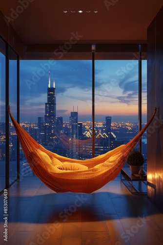Ultra-wide-angle shot of an innovative, futuristic hammock in a luxury penthouse with floor-to-ceiling windows, CG 3D rendering, city lights twinkling outside