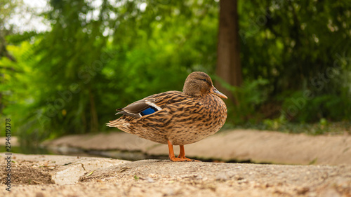 Un canard qui sèche au bord de l'eau dans un parc