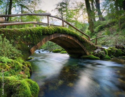 Un tranquilo canal está conectado por un antiguo puente de piedra cubierto de musgo, hiperealista, 4k
