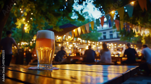 beer, festival, celebration, drink, beverage, alcohol, party, event, social gathering, people, crowd, fun, entertainment, summer, night, evening, light, decoration, flag, bunting, beer garden, oktoberfest, craft, tasting, wooden table, glasses, bokeh, blur, community, cheerful, street, cold, light