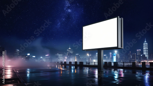 Under the velvet sky of a night city, a solitary blank billboard stands ready for a premium mockup, encapsulated by the nocturnal beauty of urban life.