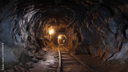 Underground mine tunnel with railway tracks, mining cart, and industrial lighting illuminating rugged rock walls in a historic mining environmen