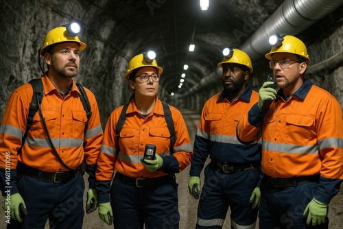 Underground mining operation with safety-focused workers using advanced detection equipment in tunnel systems