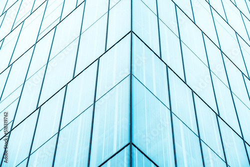 underside panoramic and perspective view to steel blue glass high rise building skyscrapers, business concept of successful industrial architecture